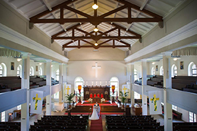 木目の梁や長椅子などハワイの歴史や温もりが感じられます。2500本ものパイプから なる壮大なパイプオルガンの音色が響き渡る中、深紅のヴァージンロードをゆっくり歩き 格式ある祭壇へ。2階席には歴代の王家の肖像画などもあり、王族の教会ならではの 部分が要所にみられます。 |